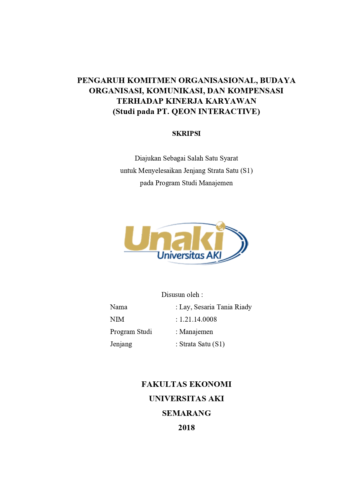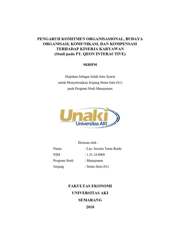 Riady, Lay, Sesaria Tania (2018) PENGARUH KOMITMEN ORGANISASIONAL, BUDAYA ORGANISASI, KOMUNIKASI, DAN KOMPENSASI TERHADAP KINERJA KARYAWAN (Studi pada PT. QEON INTERACTIVE). S1 thesis, Universitas AKI.