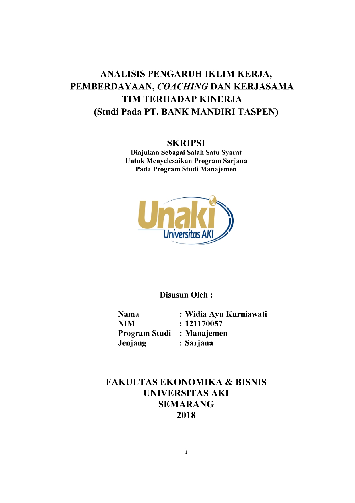 Kurniawati, Widia Ayu (2018) ANALISIS PENGARUH IKLIM KERJA, PEMBERDAYAAN, COACHING DAN KERJASAMA TIM TERHADAP KINERJA (Studi Pada PT. BANK MANDIRI TASPEN). S1 thesis, Universitas AKI.