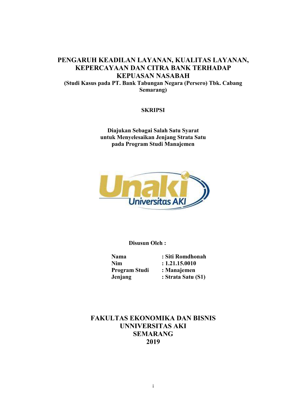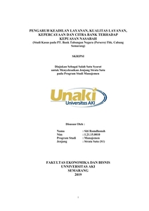 Romdhonah, Siti (2018) PENGARUH KEADILAN LAYANAN, KUALITAS LAYANAN, KEPERCAYAAN DAN CITRA BANK TERHADAP KEPUASAN NASABAH (Studi Kasus pada PT. Bank Tabungan Negara (Persero) Tbk. Cabang Semarang). S1 thesis, Universitas AKI.