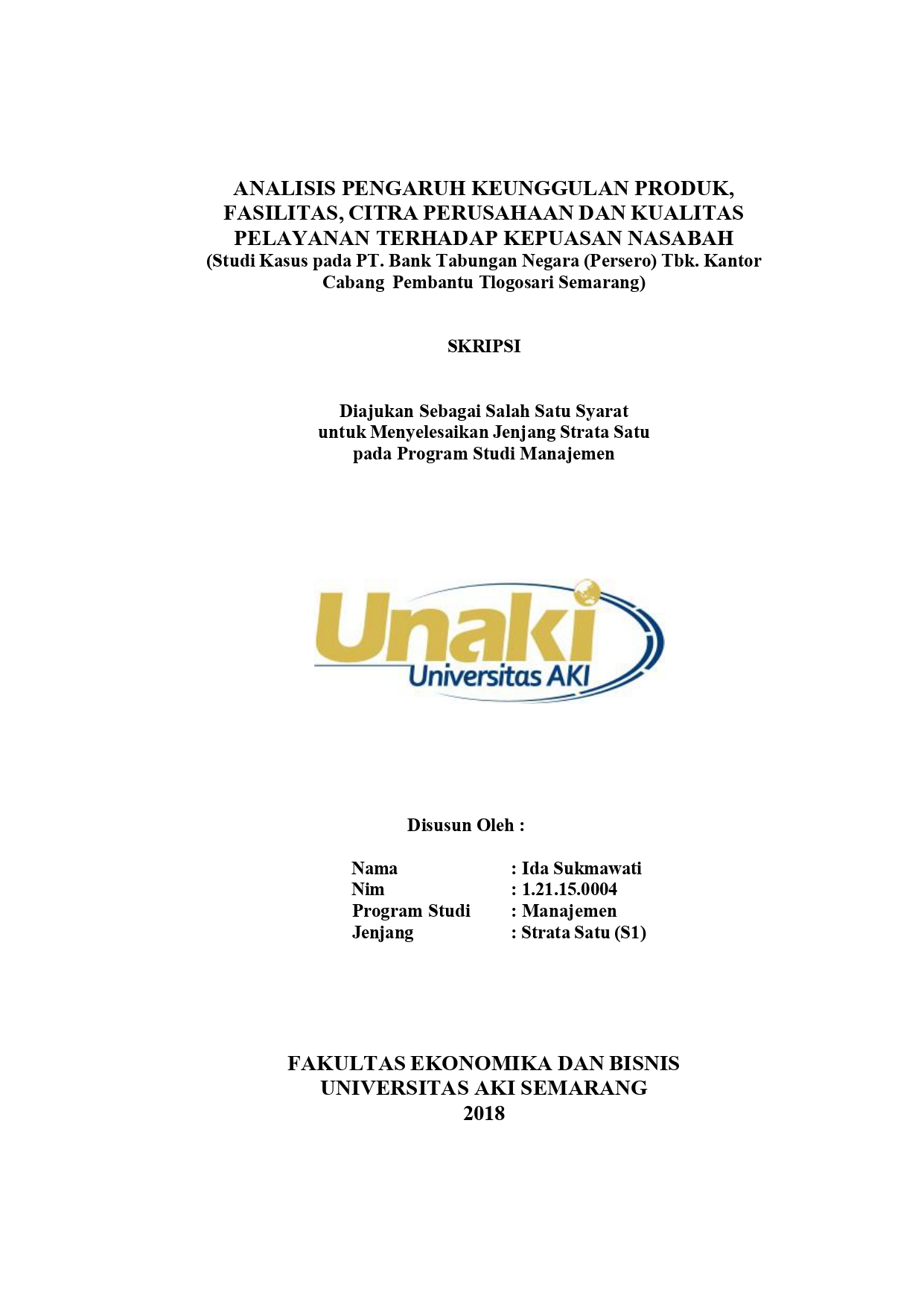 Sukmawati, Ida (2019) ANALISIS PENGARUH KEUNGGULAN PRODUK, FASILITAS, CITRA PERUSAHAAN DAN KUALITAS PELAYANAN TERHADAP KEPUASAN NASABAH (Studi Kasus pada PT. Bank Tabungan Negara (Persero) Tbk. Kantor Cabang Pembantu Tlogosari Semarang). S1 thesis, Universitas Aki.