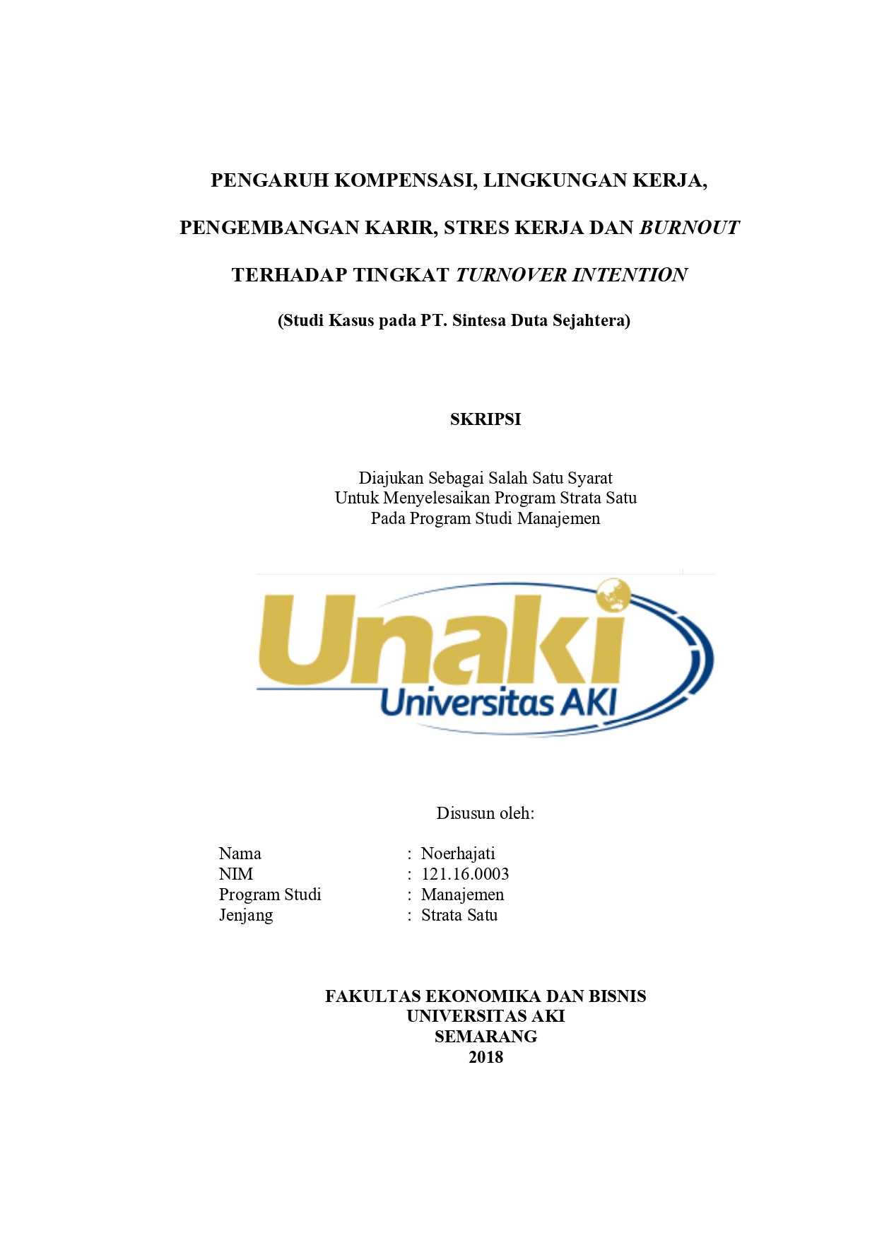 Noerhajati, Noerhajati (2018) PENGARUH KOMPENSASI, LINGKUNGAN KERJA, PENGEMBANGAN KARIR, STRES KERJA DAN BURNOUT TERHADAP TINGKAT TURNOVER INTENTION (Studi Kasus pada PT. Sintesa Duta Sejahtera). S1 thesis, Universitas Aki.