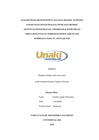 Wulandari, Cinthia Agitha (2018) ANALISIS PENGARUH SISTEM EVALUASI & SELEKSI SUPPLIER, LINGKUNGAN PENGENDALIAN, PENILAIAN RESIKO, AKTIVITAS PENGENDALIAN, INFORMASI & KOMUNIKASI SERTA PEMANTAUAN TERHADAP SISTEM AKUNTANSI PEMBELIAN PADA PT. SIANTAR TOP. S1 thesis, Universitas Aki.