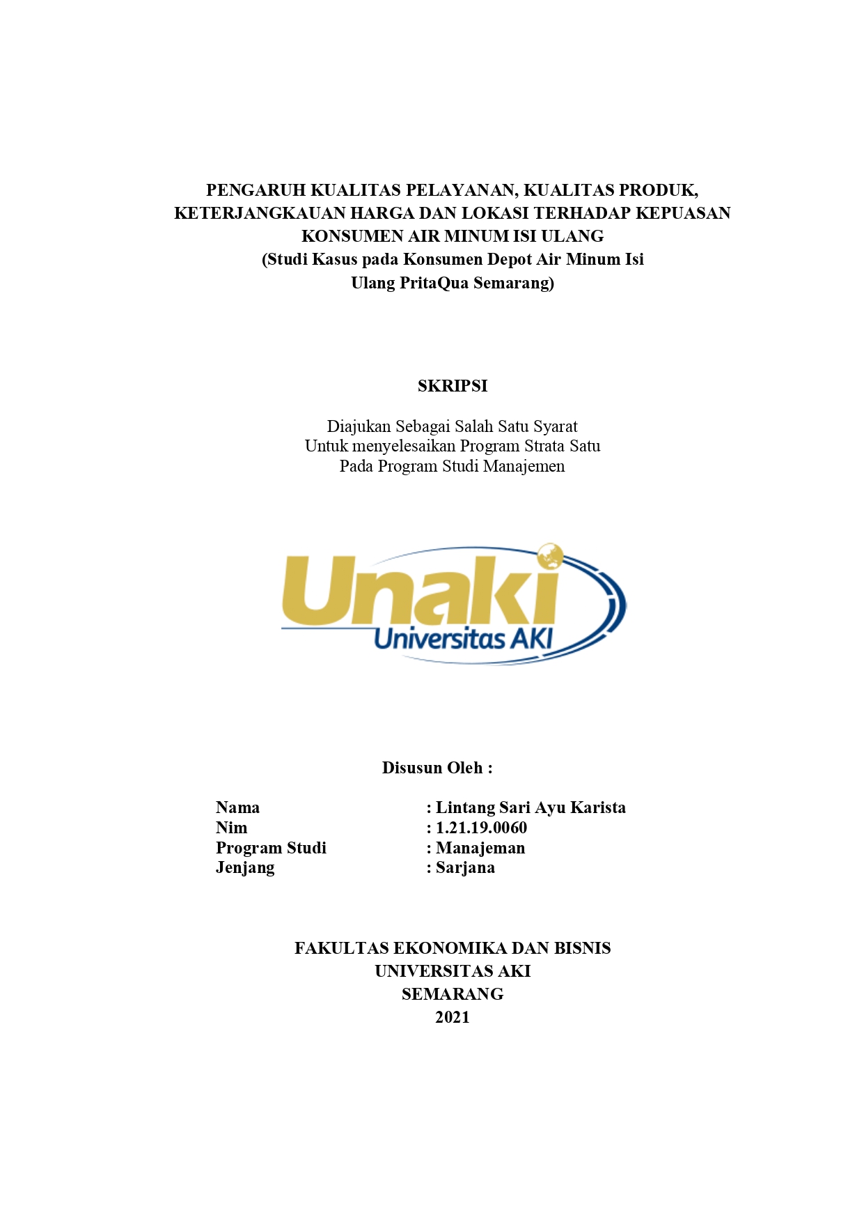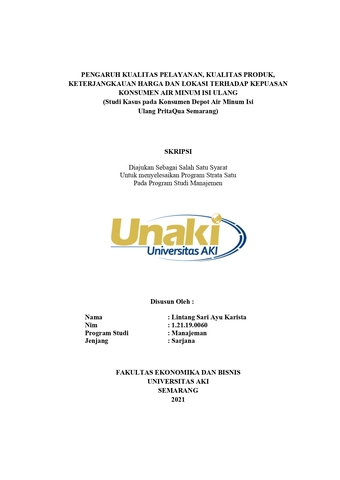Karista, Lintang Sari Ayu (2021) Pengaruh Kualitas Pelayanan, Kualitas Produk, Keterjangkauan Harga dan Lokasi Terhadap Kepuasan Konsumen Air Minum Isi Ulang Pada Depot Air Minum Isi Ulang Pritaqua Semarang. S1 thesis, Universitas AKI.