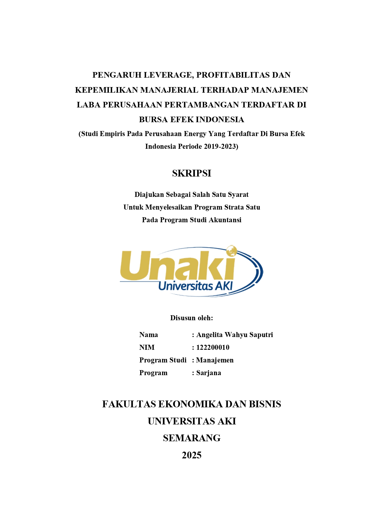 Saputri, Angelita Wahyu (2024) PENGARUH LEVERAGE, PROFITABILITAS DAN KEPEMILIKAN MANAJERIAL TERHADAP MANAJEMEN LABA PERUSAHAAN PERTAMBANGAN TERDAFTAR DI BURSA EFEK INDONESIA (Studi Empiris Pada Perusahaan Energy Yang Terdaftar Di Bursa Efek Indonesia Periode 2019-2023). S1 thesis, Universitas AKI.