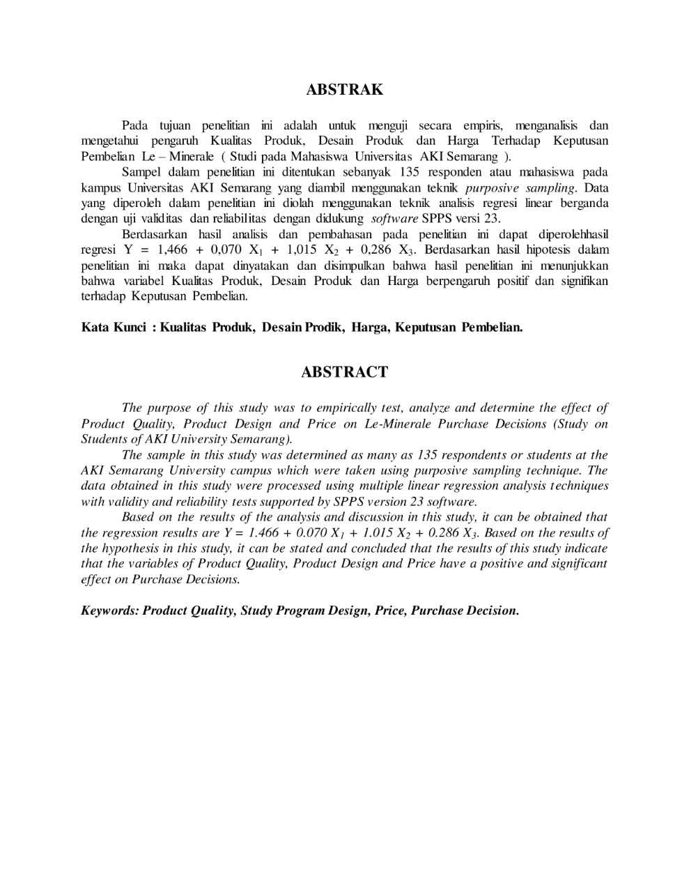 PENGARUH KUALITAS PRODUK, DESAIN PRODUK DAN HARGA TERHADAP KEPUTUSAN PEMBELIAN LE- MINERALE ( Studi pada Mahasiswa Universitas AKI Semarang )