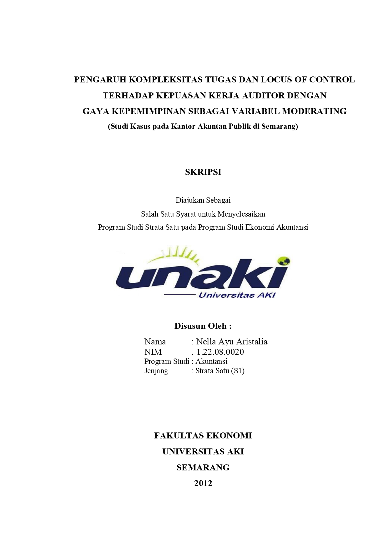 Aristalia, Nella Ayu (2012) PENGARUH KOMPLEKSITAS TUGAS DAN LOCUS OF CONTROL TERHADAP KEPUASAN KERJA AUDITOR DENGAN GAYA KEPEMIMPINAN SEBAGAI VARIABEL MODERATING (Studi Kasus pada Kantor Akuntan Publik di Semarang). S1 thesis, universitas aki.