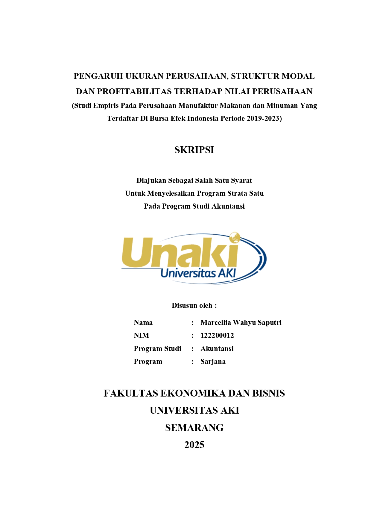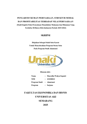 Saputri, Marcellia Wahyu (2025) PENGARUH UKURAN PERUSAHAAN, STRUKTUR MODAL DAN PROFITABILITAS TERHADAP NILAI PERUSAHAAN (Studi Empiris Pada Perusahaan Manufaktur Makanan dan Minuman Yang Terdaftar Di Bursa Efek Indonesia Periode 2019-2023). S1 thesis, Universitas AKI.