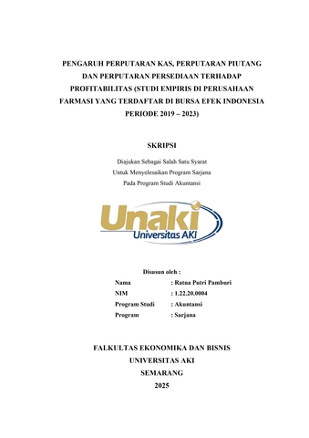 Pamburi, Ratna Putri (2025) PENGARUH PERPUTARAN KAS, PERPUTARAN PIUTANG DAN PERPUTARAN PERSEDIAAN TERHADAP PROFITABILITAS (STUDI EMPIRIS DI PERUSAHAAN FARMASI YANG TERDAFTAR DI BURSA EFEK INDONESIA PERIODE 2019 – 2023). S1 thesis, Universitas AKI.
