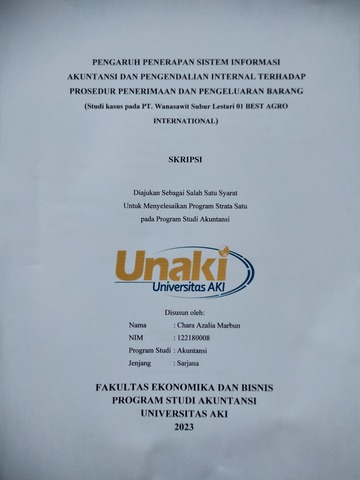 Marbun, Chara Azalia (2023) PENGARUH PENERAPAN SISTEM INFORMASI AKUNTANSI DAN PENGENDALIAN INTERNAL TERHADAP PROSEDUR PENERIMAAN DAN PENGELUARAN BARANG (STUDI KASUS PADA PT. WANASAWIT SUBUR LESTARI 01 BEST AGRO INTERNATIONAL ). S1 thesis, Universitas AKI.