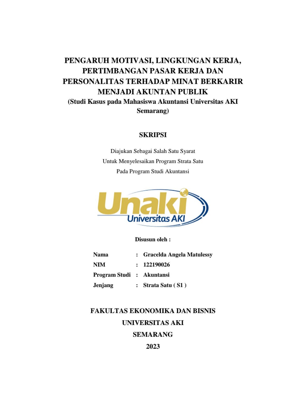 Matulessy, Gracelda Angela (2023) PENGARUH MOTIVASI, LINGKUNGAN KERJA, PERTIMBANGAN PASAR KERJA DAN PERSONALITAS TERHADAP MINAT BERKARIR MENJADI AKUNTAN PUBLIK (Studi kasus pada Mahasiswa Akuntansi Universitas AKI Semarang). S1 thesis, Universitas AKI.
