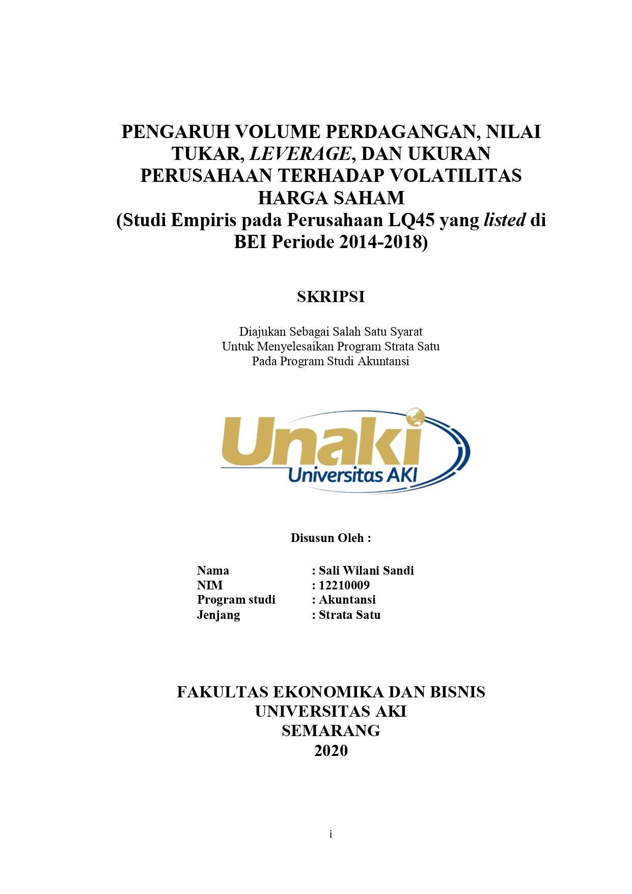 Sandi, Sali Wilani (2020) Pengaruh Volume Perdagangan, Nilai Tukar, Leverage, dan Ukuran Perusahaan Terhadap Volatilitas Harga saham (Studi Empiris pada Perusahaan LQ45 yang listed di BEI Periode 2014-2018). S1 thesis, Universitas Aki.