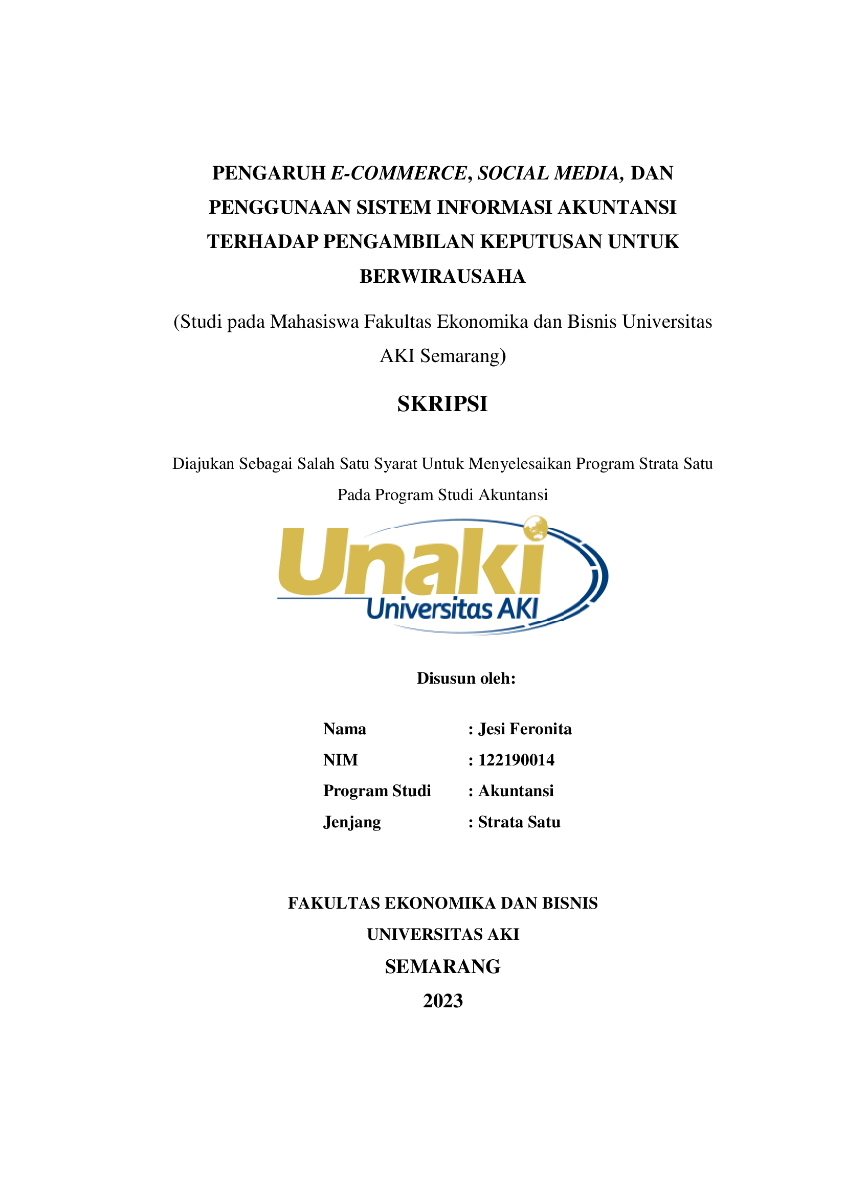 Feronita, Jesi (2023) Pengaruh E-Commerce, Social Media, Dan Penggunaan Sistem Informasi Akuntansi Terhadap Pengambilan Keputusan Untuk Berwirausaha (Studi pada Mahasiswa Fakultas Ekonomika dan Bisnis Universitas AKI Semarang). S1 thesis, Universitas AKI.