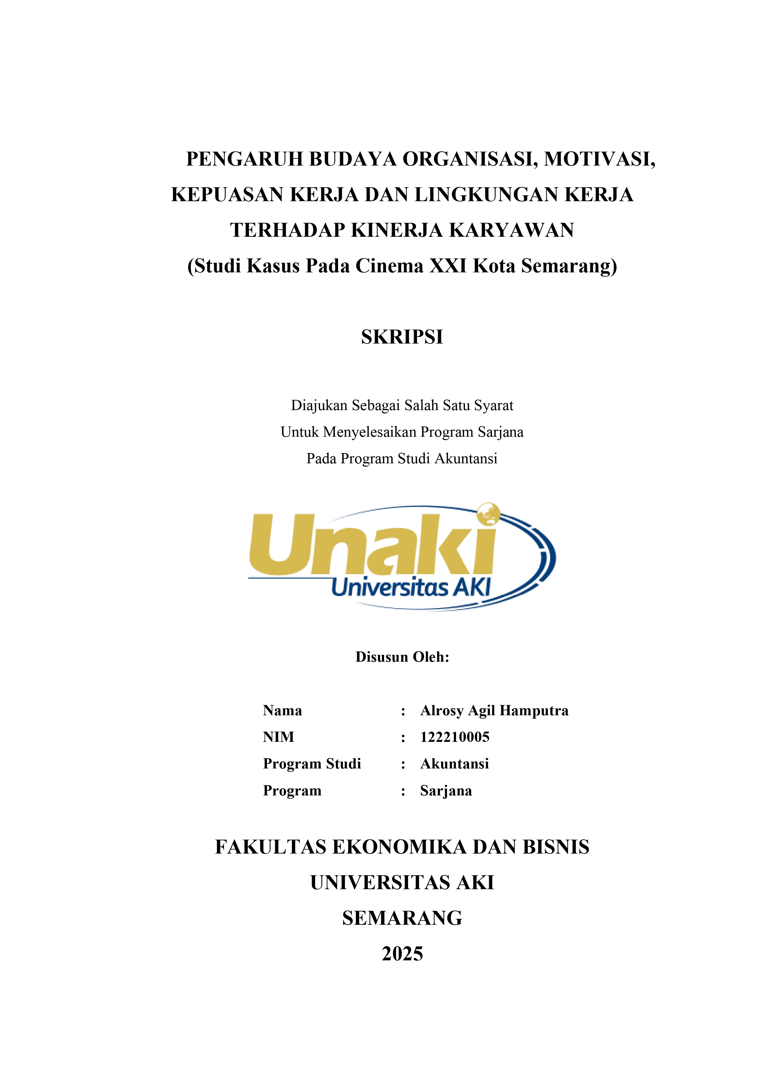 Hamputra, Alrosy Agil (2025) PENGARUH BUDAYA ORGANISASI, MOTIVASI, KEPUASAN KERJA DAN LINGKUNGAN KERJA TERHADAP KINERJA KARYAWAN (Studi Kasus Pada Cinema XXI Kota Semarang). S1 thesis, Universitas AKI.