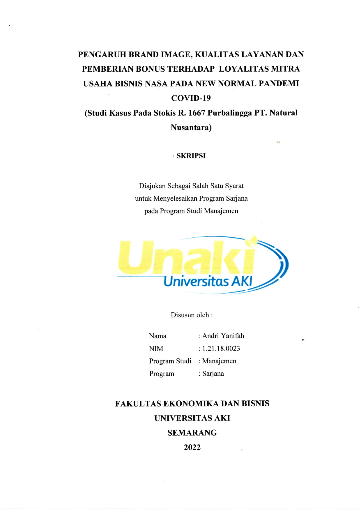 Yanifah, Andri (2022) PENGARUH BRAND IMAGE, KUALITAS LAYANAN DAN PEMBERIAN BONUS TERHADAP LOYALITAS MITRA USAHA BISNIS NASA PADA NEW NORMAL PANDEMI COVID-19 (Studi Kasus Pada Stokis R. 1667 Purbalingga PT. Natural Nusantara). S1 thesis, Universitas AKI.