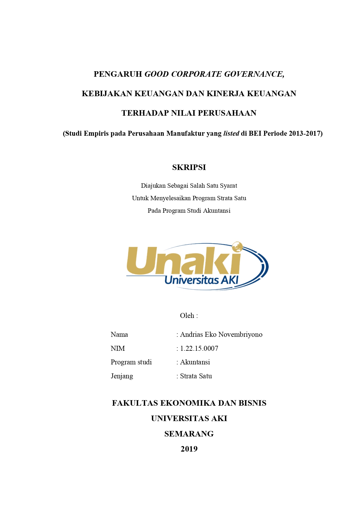 Novembriyono, Andrias Eko (2019) Pengaruh Good Corporate Governance, Kebijakan Keuangan, dan Kinerja Keuangan terhadap Nilai Perusahaan (Studi Empiris pada Perusahaan Manufaktur yang listed di BEI Periode 2013-2017). S1 thesis, Universitas Aki.