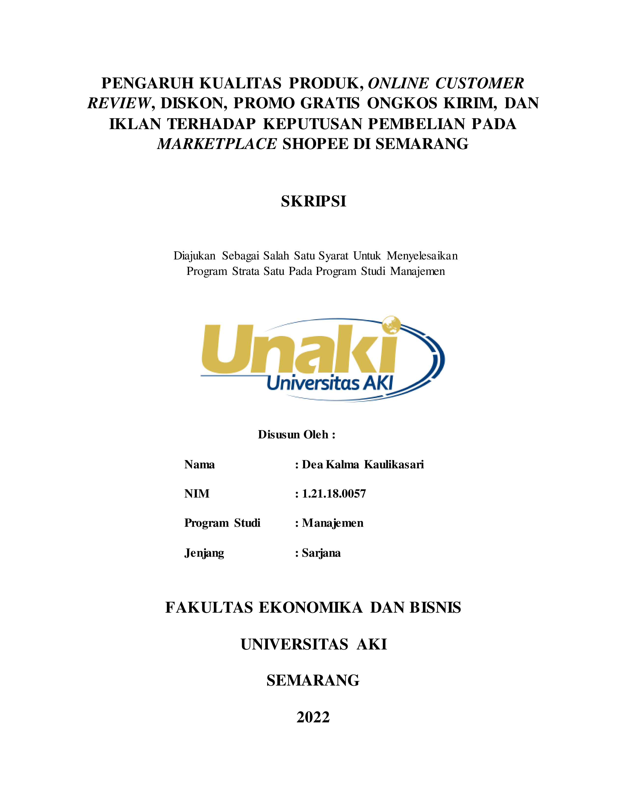 Kaulikasari, Dea Kalma (2022) PENGARUH KUALITAS PRODUK, ONLINE CUSTOMER REVIEW, DISKON, PROMO GRATIS ONGKOS KIRIM, DAN IKLAN TERHADAP KEPUTUSAN PEMBELIAN PADA MARKETPLACE SHOPEE DI SEMARANG. S1 thesis, Universitas AKI.