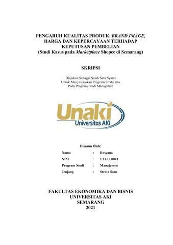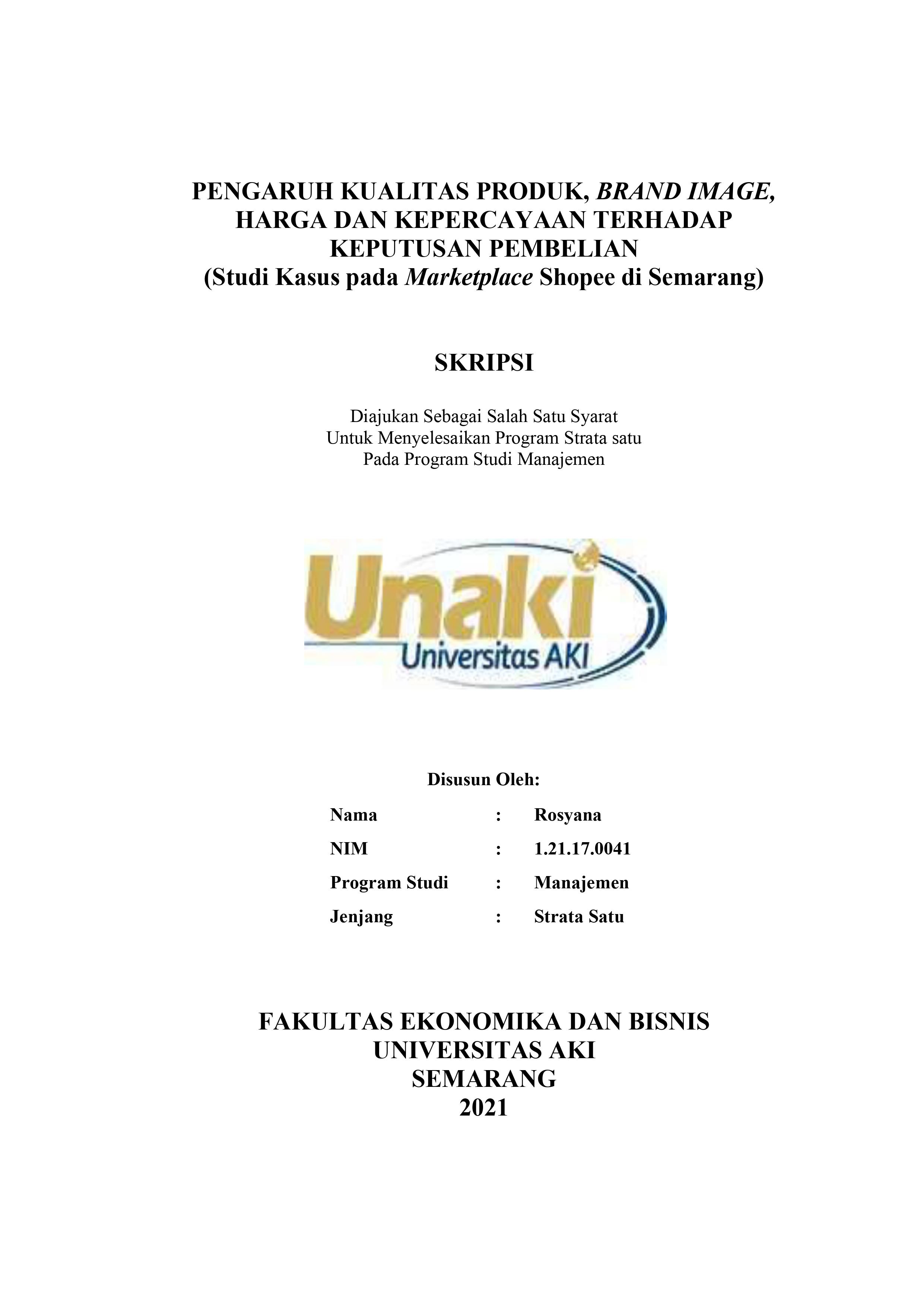 Rosyana, Rosyana (2021) PENGARUH KUALITAS PRODUK, BRAND IMAGE, HARGA DAN KEPERCAYAAN TERHADAP KEPUTUSAN PEMBELIAN (Studi Kasus pada Marketplace Shopee di Semarang). S1 thesis, Universitas Aki.