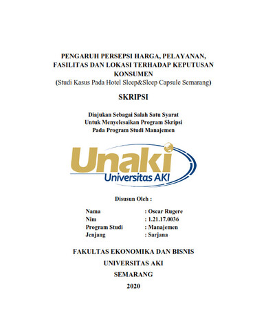 Rugere, Oscar (2021) PENGARUH PERSEPSI HARGA, PELAYANAN, FASILITAS DAN LOKASI TERHADAP KEPUTUSAN KONSUMEN (Studi Kasus Pada Hotel Sleep&Sleep Capsule Semarang). S1 thesis, Universitas Aki.