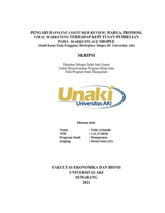 Arianthi, Nella (2021) PENGARUH ONLINE COSTUMER REVIEW, PERSEPSI HARGA, PROMOSI, VIRAL MARKETING TERHADAP KEPUTUSAN PEMBELIAN PADA MARKETPLACE SHOPEE (Studi Kasus Pada Pengguna Marketplace Shopee Pada Mahasiswa Prodi Manajemen di Universitas AKI). S1 thesis, Universitas Aki.