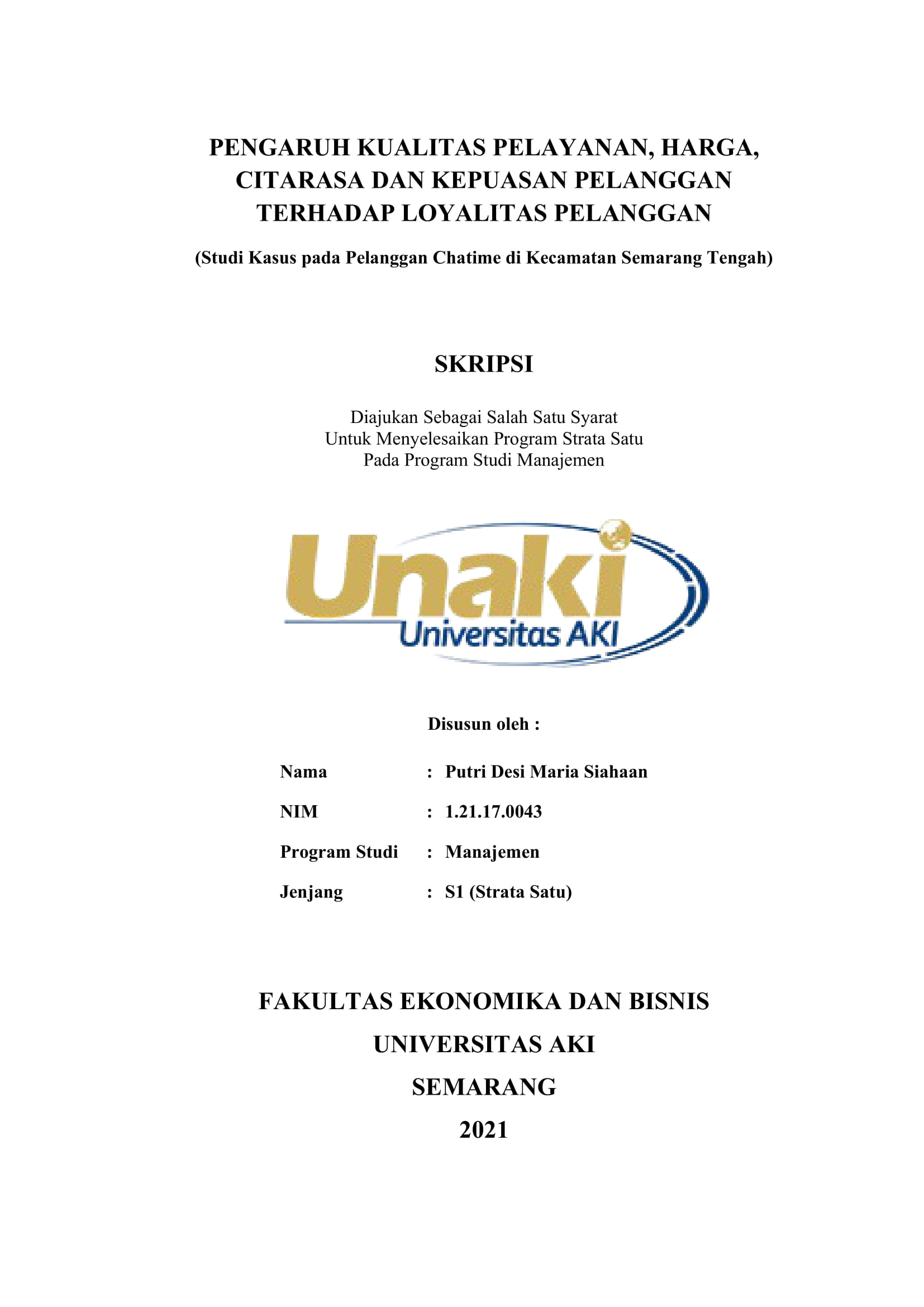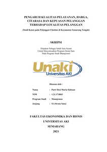 Siahaan, Putri Desi Maria (2021) PENGARUH KUALITAS PELAYANAN, HARGA, CITARASA DAN KEPUASAN PELANGGAN TERHADAP LOYALITAS PELANGGAN (Studi Kasus pada Pelanggan Chatime di Kecamatan Semarang Tengah). S1 thesis, Universitas Aki.