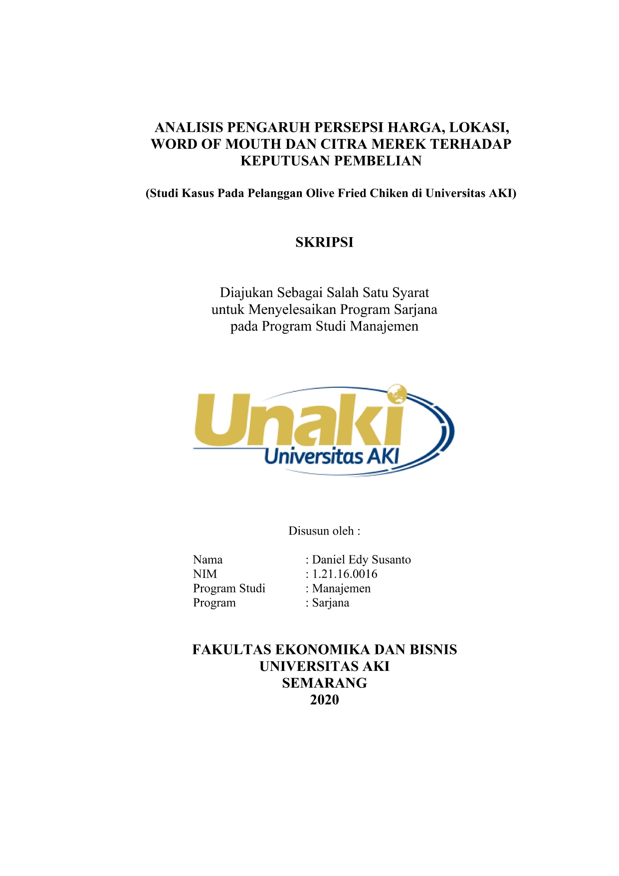 ANALISIS PENGARUH PERSEPSI HARGA, LOKASI, WORD OF MOUTH DAN CITRA MEREK TERHADAP KEPUTUSAN PEMBELIAN (Studi Kasus Pada Pelanggan Olive Fried Chiken di Universitas AKI)