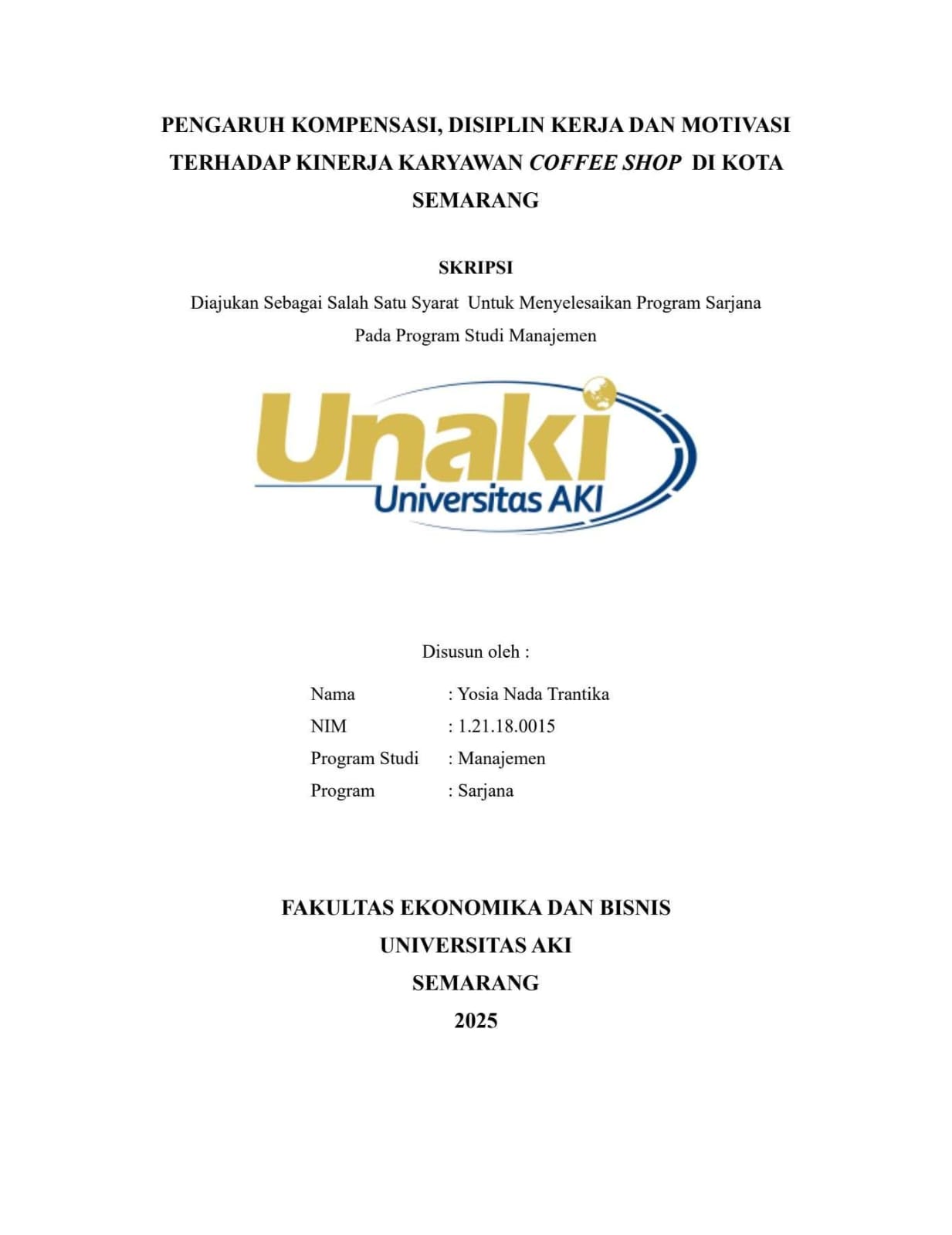 Trantika, Yosia Nada (2025) PENGARUH KOMPENSASI, DISIPLIN KERJA DAN MOTIVASI TERHADAP KINERJA KARYAWAN COFFEE SHOP DI KOTA SEMARANG. S1 thesis, Universitas AKI.