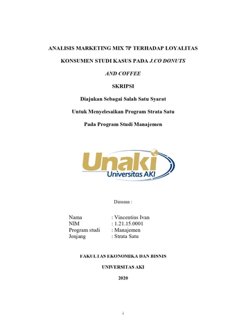 Ivan, Vincentius (2020) ANALISIS MARKETING MIX 7P TERHADAP LOYALITAS KONSUMEN STUDI KASUS PADA J.CO DONUTS AND COFFEE. S1 thesis, Universitas Aki.