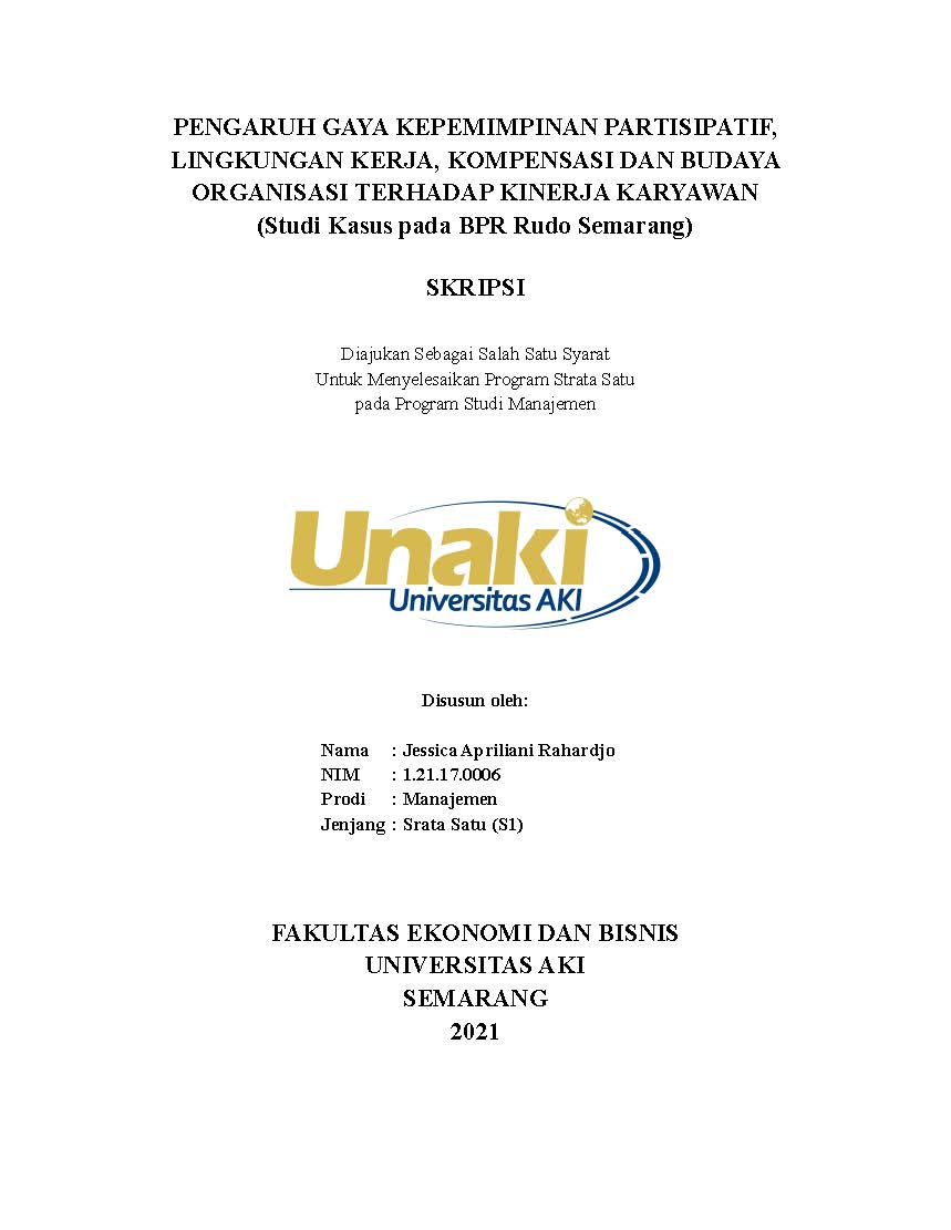 Rahardjo, Jessica Apriliani (2021) PENGARUH GAYA KEPEMIMPINAN PARTISIPATIF, LINGKUNGAN KERJA, KOMPENSASI DAN BUDAYA ORGANISASI TERHADAP KINERJA KARYAWAN (Studi Kasus pada BPR Rudo Semarang). S1 thesis, Universitas Aki.