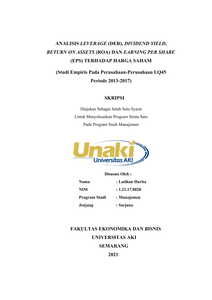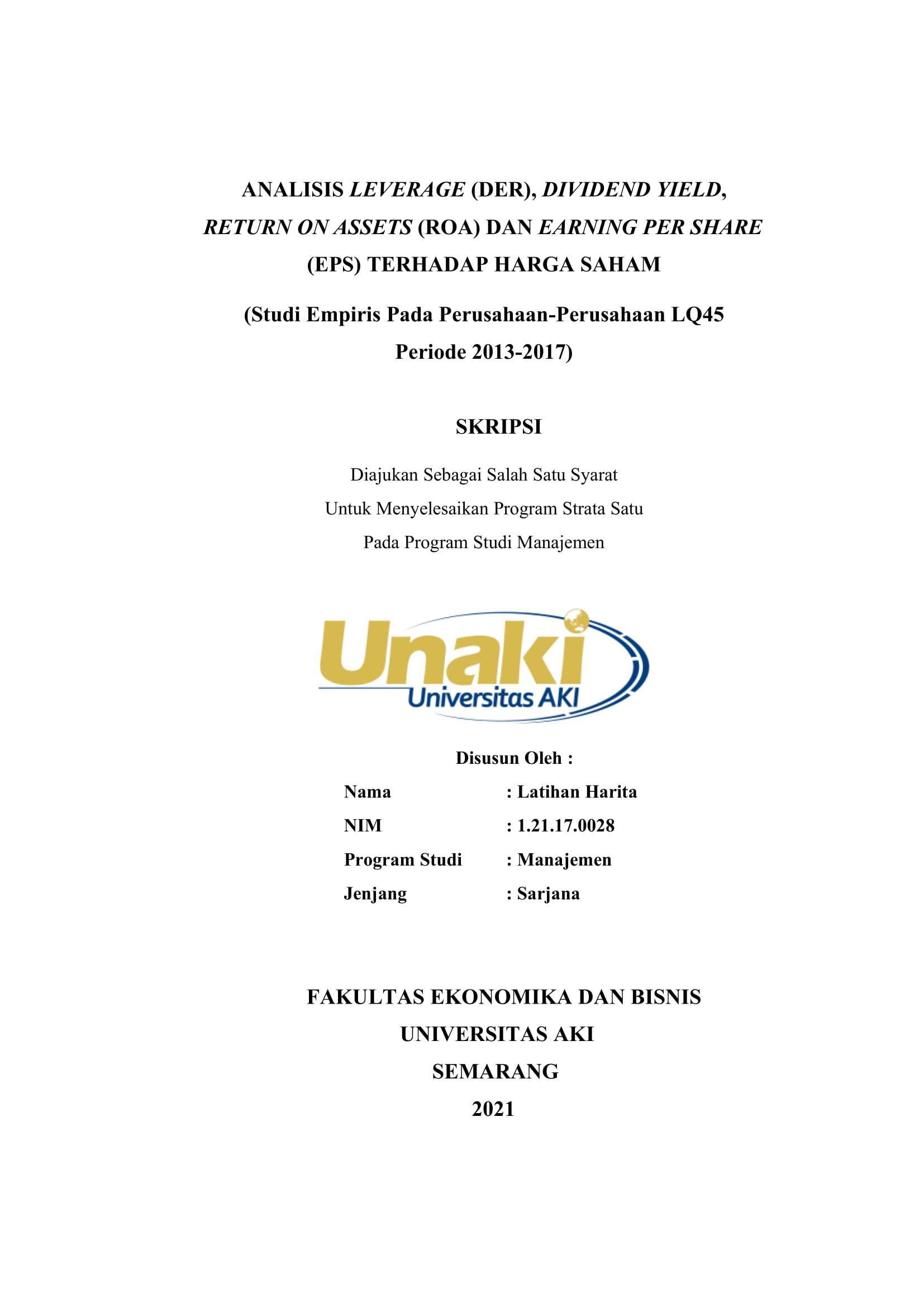 Harita, Latihan (2021) ANALISIS LEVERAGE (DER), DIVIDEND YIELD, RETURN ON ASSETS (ROA) DAN EARNING PER SHARE (EPS) TERHADAP HARGA SAHAM (Studi Empiris Pada Perusahaan-Perusahaan LQ45 Periode 2013-2017). S1 thesis, Universitas AKI.