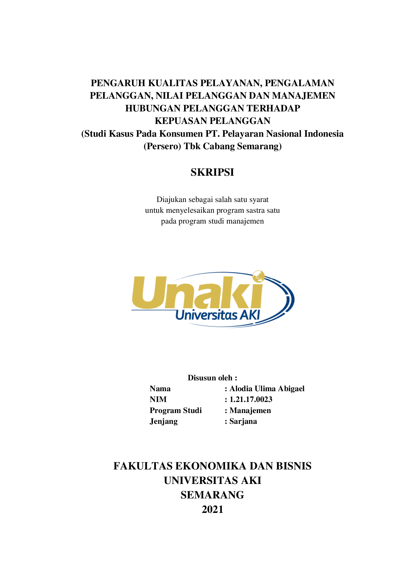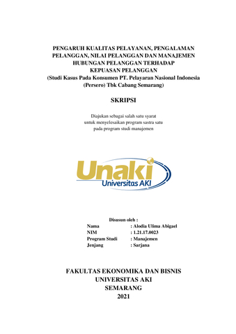 Abigael, Alodia Ulima (2021) PENGARUH KUALITAS PELAYANAN, PENGALAMAN PELANGGAN, NILAI PELANGGAN DAN MANAJEMEN HUBUNGAN PELANGGAN TERHADAP KEPUASAN PELANGGAN (Studi kasus pada PT. Pelayaran Nasional Indonesia (Persero) Tbk Cabang Semarang). S1 thesis, Universitas AKI.