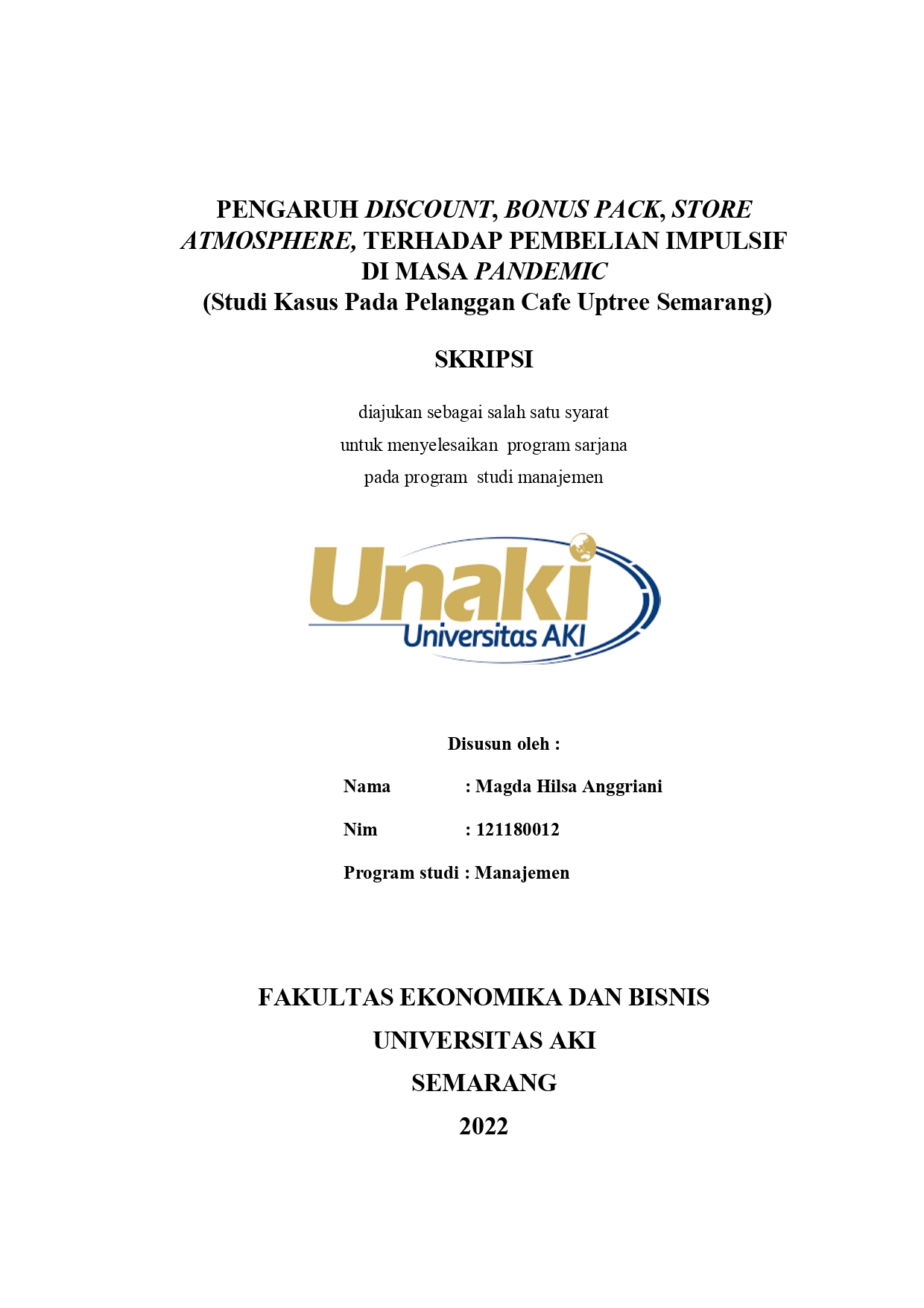 Anggriani, Magda Hilsa (2022) PENGARUH DISCOUNT, BONUS PACK, STORE ATMOSPHERE, TERHADAP PEMBELIAN IMPULSIF DI MASA PANDEMIC (Studi Kasus Pada Pelanggan Cafe Uptree Semarang). S1 thesis, Universitas Aki.